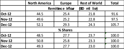 Les envois depuis l’Amérique du Nord se sont élevés à plus de 119 millions de dollars pour le dernier trimestre 2012 représentent la moitié des transferts.
